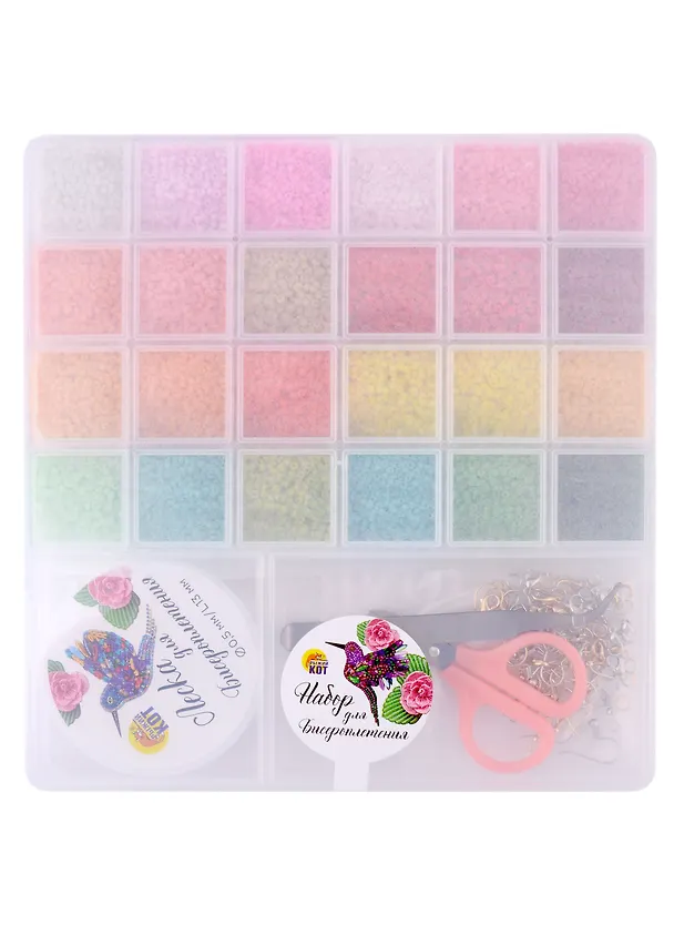 Качественный товар, в каждом ячейке есть всё необходимое (бисеры идеальны в достаточном количестве - хватит надолго, имеют яркие и насыщенные цвета).