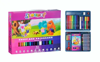 Набор для детского творчества 52 предмета "Пушистики" (фломастеры, восковые мелки, карандаши, текстовыделитель, линейка, ножницы, ластик, точилка, механический карандаш, грифели) картонная коробка, Silwerhof