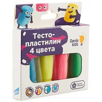 Общая информация об изделии: Набор с тесто-пластилином - 4 цвета по 30 гр. в полипропиленовой пленке (пакетики), . Упаковка: картонная коробка. Материал, из которого изготовлена продукция по данным производителя: Состав теста: мука, вода, крахмал, соль, ароматизатор, краситель. Материал, из которого изготовлена индивидуальная упаковка изделия: Материал обертки - PP. Упаковка - картон. Комплектность изделия с указанием количества: Тесто-пластилин (30 гр.) - 4 шт.