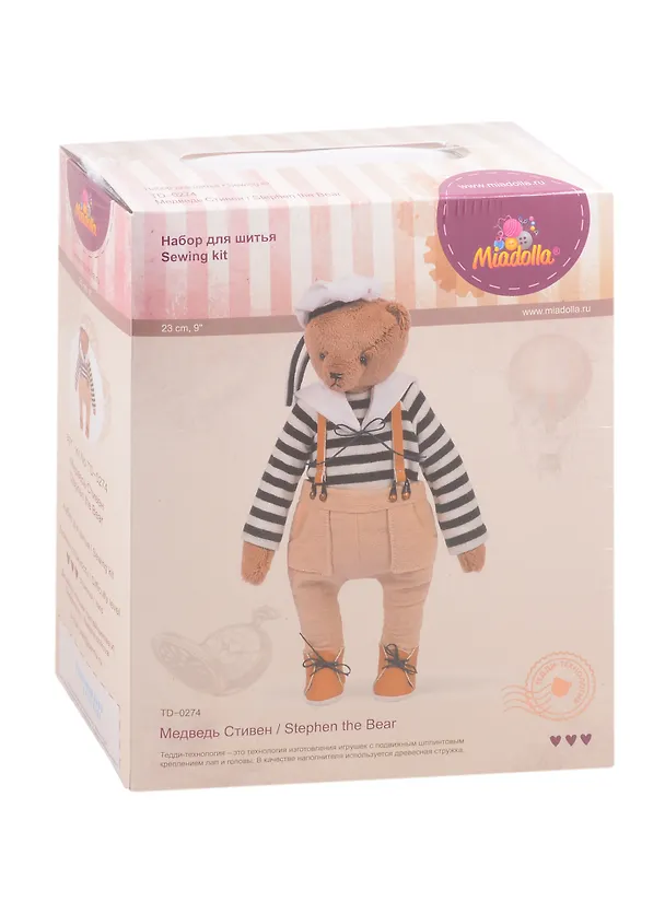 В набор входят все необходимые материалы: плюш, лен, трикотаж, искусственная кожа, металлические шплинты и диски из фибры, бусины, брадсы, пластичная замша, хлопчатобумажные нитки мулине Gamma, швейные нитки, швейная игла, древесная стружка, металлический гранулят, выкройка, подробная инструкция с картинками.Игрушка выполняется по классической тедди-технологии - это технология изготовления игрушек с подвижным шплинтовым креплением лап и головы. В качестве наполнителя используется древесная стружка.
