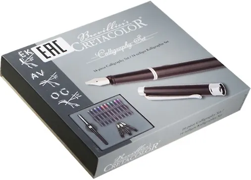 Набор для каллиграфии в подарочной коробке, изготовлен CRETACOLOR Австрия. Перьевая ручка классического дизайна с тремя сменными перьями, различной толщины - 1,1 мм, 1,5 мм и 1,9 мм. В набор входит цветная тушь пяти цветов, по два картриджа каждого цвета - черный,синий, фиолетовый, зеленый, красный. Примеры шрифтов из буклета с прописями, позволят Вам приобрести навыки каллиграфического письма.