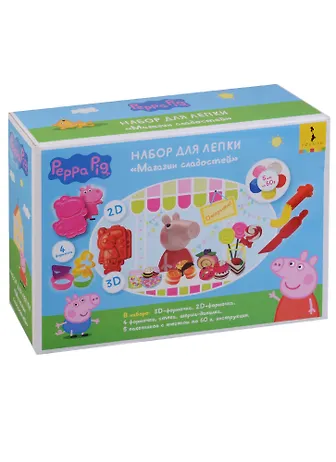 В наборе "Магазин сладостей" ТМ "Свинка Пеппа" 14 предметов: 3D-формочка Пеппы, 2D-формочка Сьюзи, 4 формочки для лепки сладостей, 5 пакетиков теста по 60 г, стека, шприц-давилка, цветная двусторонняя инструкция (А5). Мягкое тесто очень пластично, не прилипает к рукам и рабочей поверхности, не имеет запаха, застывает на воздухе в течение 12-24 часов. Внимание: не пригодно для еды! Товар сертифицирован. Упаковка: цветная коробка (19x14x6 см).