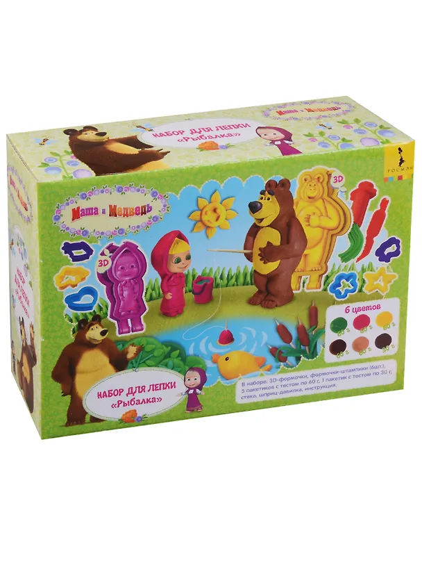В наборе "Рыбалка" ТМ "Маша и Медведь" 17 предметов: две 3D-формочки (Маша и Медведь), 6 формочек-штампов, 5 пакетиков цветного теста по 60 г, 1 пакетик теста по 30 г, стека, шприц-давилка, цветная инструкция (А5). Тесто пластичное, не липнет к рукам и рабочей поверхности, не имеет запаха, застывает на воздухе в течение 12-24 часов. Внимание: не пригодно для еды! Товар сертифицирован. Упаковка: коробка 19x14x6 см.