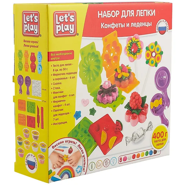 В наборе "Конфеты и леденцы" ТМ Let`s play 38 предметов: 8 цветов теста для лепки по 50 г, 2 формочки леденцов, 5 3D-формочек пирожных, скалка, стека, 6 блестящих фантиков для конфет, 4 формочки для конфет, 10 палочек для леденцов, инструкция. Мягкое тесто для лепки пластично, не липнет к рукам, застывает на воздухе в течение 12 - 24 часов, состоит из натуральных ингредиентов и безопасно для детей. ВНИМАНИЕ: непригодно для еды! Аксессуары изготовлены из пластика. Товар сертифицирован. Упаковка: коробка (25х8х26,5 см).