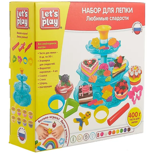 В наборе "Любимые сладости" ТМ Let`s play 17 предметов: 8 цветов теста для лепки по 50 г, этажерка для пирожных (15х18 см) с формочками, 4 формочки пирожных, скалка, стека, шприц-давилка, инструкция. Мягкое тесто для лепки пластично, не липнет к рукам, застывает на воздухе в течение 12 - 24 часов, состоит из натуральных ингредиентов и безопасно для детей. ВНИМАНИЕ: непригодно для еды! Аксессуары изготовлены из пластика. Товар сертифицирован. Упаковка: коробка (25х8х26,5 см).