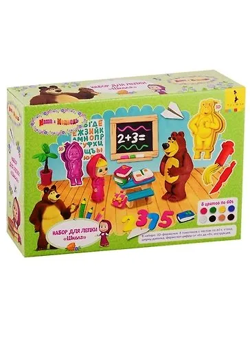 В наборе для лепки "Школа" ТМ "Маша и Медведь" 23 предмета: две 3D-формочки Маши и Медведя, 8 пакетиков цветного теста по 60 г, 10 формочек-цифр от 0 до 9, стека, шприц-давилка, пошаговая цветная инструкция в картинках. Тесто для лепки застывает на воздухе за несколько часов. ВНИМАНИЕ: тесто не пригодно для еды. Аксессуары вып