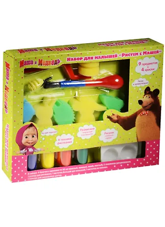 Набор для малышей Рисуем с Машей (31073) (в наборе: баночки с красками по 20 мл - 4 шт., спонжики для рисования - 5 шт., роллер для рисования, кисточка большая для малышей, кисточка на пальчик, палитра для смешивания цветов) (3+) (Маша и Медведь) (eOne)