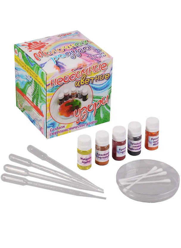 Набор использует физические свойства жидкостей для создания фантастических разноцветных узоров. Поверхностное натяжение заставляет жидкости с разными свойствами перемешиваться, а если эти жидкости разноцветные и у Вас есть специальное вещество, которое уменьшает поверхностное натяжение, то игра красок становится завораживающей. Набор понравится не только маленьким детям, но и мамам с папами.
