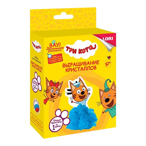Выращивание кристаллов Три кота — увлекательное занятие с любимыми героями мультфильма. Химический опыт несложно провести, все необходимые комплектующие и реактивы уже входят в набор, поэтому никаких дополнительных материалов приобретать не нужно. Достаточно следовать инструкции, и кристалл начнет расти в этот же день. Благодаря набору ребенок сможет получить знания о том, как протекает химическая реакция кристаллизации веществ. Комплектация: Раствор карбамида и поливинилового спирта с красителем, фигурка-основа для выращивания кристалла, фильтровальная бумага, скрепка канцелярская, инструкция.