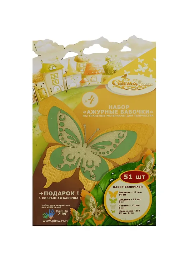 Набор для творчества для всей семьи - набор "Ажурные бабочки", 51 штука: Большие - 12 штук, 14 см; Средние - 12 штук, 9 см; Резные - 12 штук, 8 см, Маленькие - 2х6, 12 штук, 6 см.