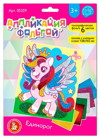 Аппликация из фольги «Единорог»- новинка среди аппликаций! Она состоит из цветной карточки с изображением милой принцессы и листов цветной фольги. Декорируя картинку фольгой, вы получаете оригинальный шедевр - яркую, цветную открытку, которая может стать замечательным подарком! Состав набора: - картонная основа с напечатанным цветным рисунком и клеевым слоем (размер 13,8 х 16,5 см) – 1 шт; - цветная фольга (10х10 см) - 6 цветов. Набор рекомендуется для детей в возрасте от 3 лет. Как играть? 1. Рассмотрите картинку-образец на упаковке. Определите, на какие участки картинки-основы будет наклеиваться фольга. 2. Снимите верхний защитный слой с необходимых фрагментов одного ц