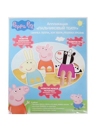 В наборе «Пальчиковый театр»: 3 фигуры с отверстиями для пальчиков (Свинка Пеппа – 12 см, Зебра Зоя – 12 см, Кролик Ребекка – 15 см), картонная полянка на подставке, самоклеящиеся цветные детали для аппликации из мягкого материала ЭВА, блестящие стразы с клеевым слоем
