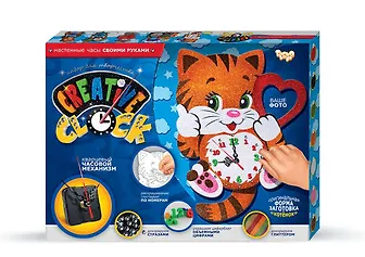 Набор для творчества "Котенок" позволит своими руками создать забавные настенные часы. Сделать это не составит труда, достаточно просто следовать подробной инструкции. В наборе имеются основа, часовой механизм, цифры, глиттер разных цветов, а также небольшие стразы, которыми можно будет украсить готовую работу.