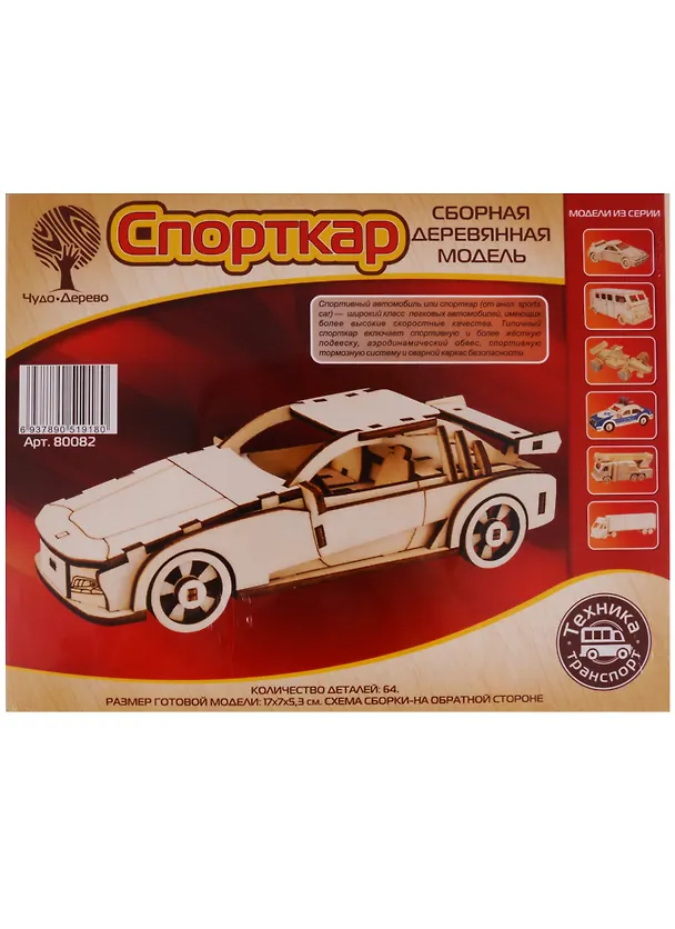 Хорошая деревянная модель. Ребёнку 8 лет собирал сам, достаточно быстро. Внутри один деревянный лист с запчастями. Детальки достаточно прочные, трещин и сколов нет. Собирается легко, нужно просто вставить в пазы. Модель машинки выходит средних размеров, можно покрасить краской при желании.