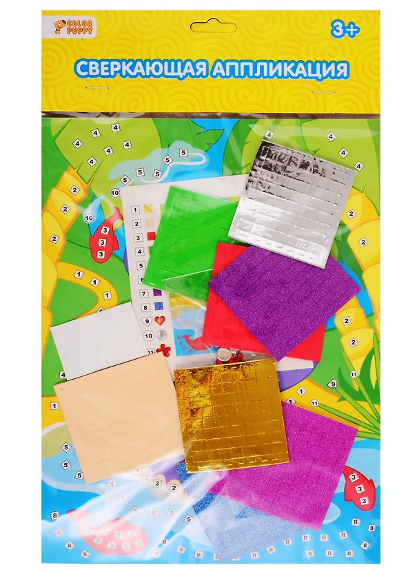 Сверкающая аппликация «Слонёнок» от ТМ Color Puppy - увлекательный творческий набор, с которым справятся даже самые маленькие. Занимаясь данным видом творчества, ребёнок будет тренировать пальчики рук, развивать тактильные ощущения, усидчивость и внимательность. В набор входят цветные блестящие самоклеящиеся элементы мозаики и красивая картинка. За каждым цветом закреплён определенный номер. Задача ребёнка - наклеить элементы мозаики на изображение, подбирая цвета по номерам. Размер картинки (ДхШ) составляет 18,5х26 см. Материалы изготовления: картон, полимерные материалы, в т.ч. с элементами пластмассы. Рекомендованный возраст: 3 года +