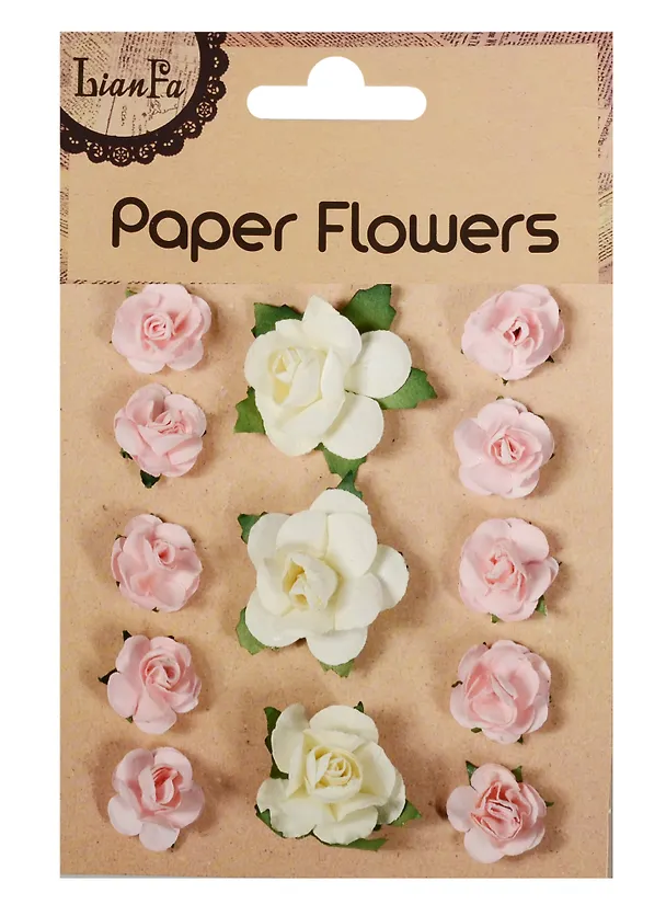 В комплекте 26 бумажных цветов в молочных и нежно-розовых оттенках. Среди них 6 больших бутонов размера 3 см, а также 20 маленьких по 1,5 см. Все цветы дополнены аккуратными зелёными листочками.