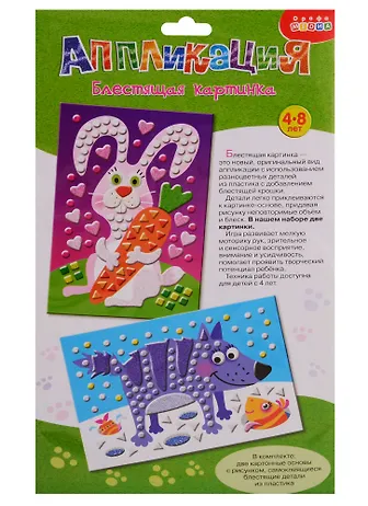 Наклеивать сверкающие детали легко: просто снимите деталь с защитной плёнки и приложите к отмеченному месту на рисунке. В наборе используются детали простых и понятных ребёнку форм: квадратики, треугольники, ромбики и т. п. Сделанная своими руками картинка — отличный подарок для родных и близких.