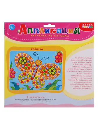 Пуговицы были придуманы в качестве декоративного украшения одежды, а функцию застежки стали выполнять значительно позже. Мы вспомнили о первоначальном предназначении пуговицы — украшать, и придумали необычную аппликацию! Пуговицы не нужно пришивать — они легко приклеиваются на картинку-основу, придавая изделию декоративность и причудливый рельеф. Получившаяся картинка приятно удивит своей яркостью, необычностью и простотой исполнения. В наборе: — цветная основа с рисунком и схемой размещения деталей, — разноцветные пуговицы (5 цветов), — декоративные элементы из дерева (цветочки), — декоративные элементы на самоклеящейся основе (стразы), клей, — цветная листовка-образец. Возраст: 3—6 лет. Размер аппликации: 20х25 см. Размер упаковки: 25х25х0,7 см.