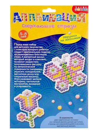 Если ребёнок любит аппликации и уже хорошо справляется с приклеиванием крупных деталей — самое время перейти на новый уровень. Для этого прекрасно подойдёт набор «Сверкающие стразы. Игрушки на магнитах». Наклеивание мелких деталей поможет ребёнку развить точность движений рук, стать более внимательным и усидчивым, а результат порадует глаз.