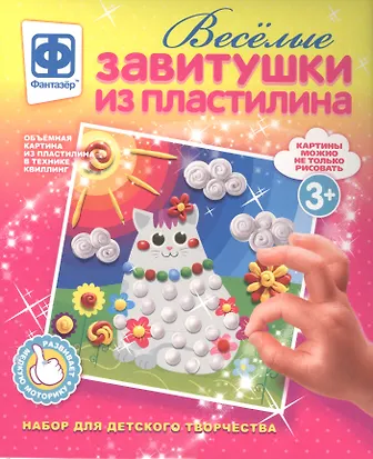 Представляем вам набор, являющий собой удивительную смесь сразу нескольких видов техник лепки, доступные малышам. Ваш ребёнок легко их освоит с набором для творчества "Весёлые завитушки". В наборе есть всё, к что нужно для создания объёмной картины: картонная основа, пластилин и инструкция. Кусочек пластилина нужного цвета скатываете в колбаску и делаете завитушку, прикрепив её в р определённое место. Картина получается фактурной! Эта техника чем-то напоминает квиллинг. Элементы получаются яркими и объёмными, а картина - оригинальной.