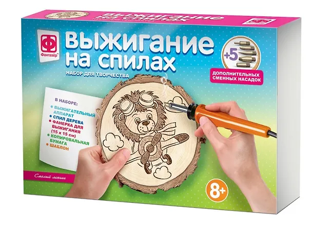 Набор: выжигательный аппарат со сменными насадками, спил для выжигания, наждачная и копировальная бумага, шаблон, инструкция.