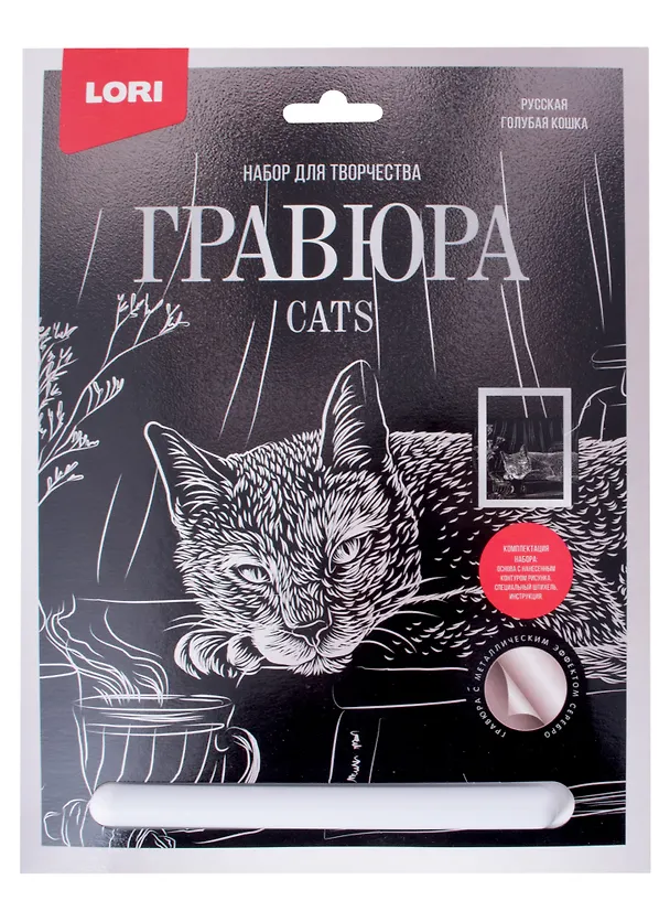Гравюра выполнена в анималистическом жанре. Фоном служит схематично прописанный натюрморт – длинные штрихи, подробных деталей нет. Выполняется легко и быстро. Центральное место отведено главному персонажу – русской голубой кошке. Сходство с данной породой передано хорошо благодаря тщательно проработанной штриховке. Штрихи мелкие, короткие. Необходимо аккуратно работать штихелем, соблюдая направление каждого штриха и регулируя интенсивность нажима на инструмент. В целом получилась симпатичная картина. После оформления в рамку приобретает законченный вид.