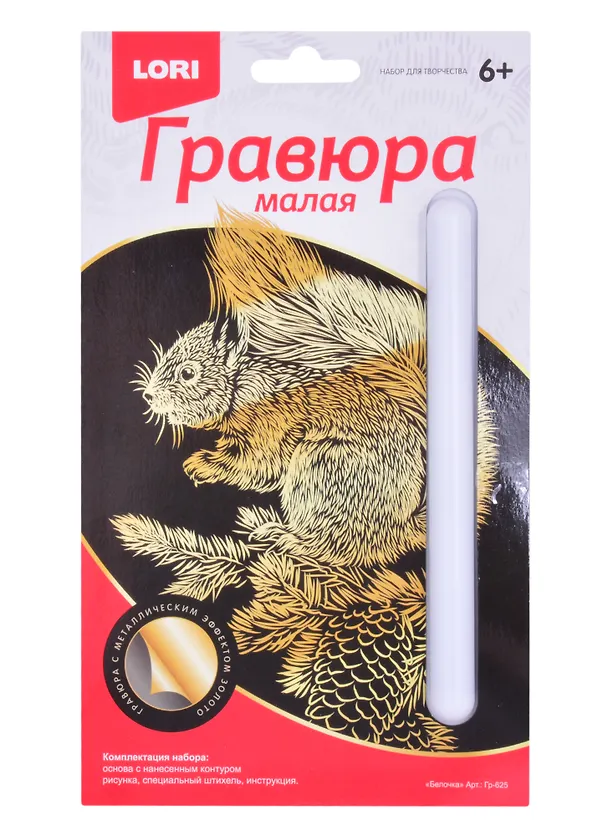 Очень хороший творческий набор, в конце получается красивый рисунок белочки с золотым отливом! Ее было приятно выцарапывать, контур рисунка четкий, также черная краска легко отходит. Не смотря на рейтинг 6+ гравюру приятно делать и взрослым. Процесс создания картинки расслабляет и помогает отвлечься. Готовая гравюра является отличным украшением интерьера