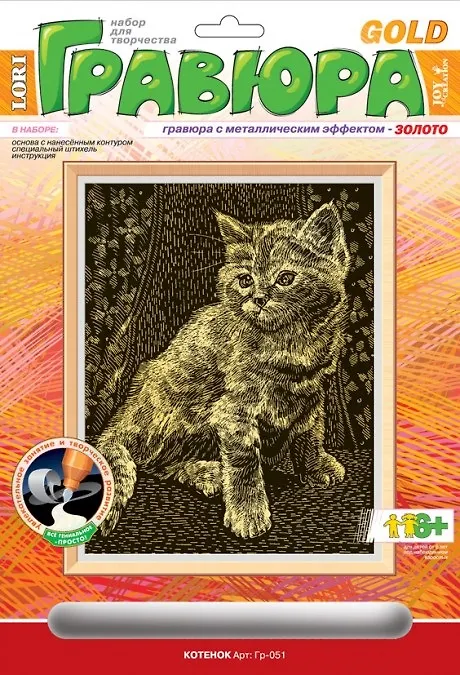 Очень симпатичная гравюра. Размеры самой гравюры 18х23.5 см. Гравюра как в описании золотистого цвета в наборе есть штихель для черчения, а из самой упаковки можно сделать рамочку для изображения. Хотя в описании заявлен возраст от 6 лет, думаю для этого возраста слишком много деталей на изображении, это для детей чуть постарше.