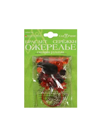 Из имеющихся в наборе бусин ,кулона , фурнитуры , ювелирногно тросика можно собрать три предмета:ожерелье,браслет ,серьги.Для работы понадобятся плоскогубцы для создания петелек на концах гвоздиков и для закрепления зажимов и колец.