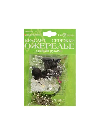 Из имеющихся в наборе бусин ,кулона , фурнитуры , ювелирногно тросика можно собрать три предмета:ожерелье,браслет ,серьги.Для работы понадобятся плоскогубцы для создания петелек на концах гвоздиков и для закрепления зажимов и колец.