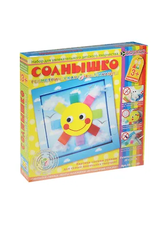 Описание: Это доброе сказочное солнышко с цветными лучиками-лентами светит в ясном небе, по которому плывут пушистые облачка. Малыш легко смастерит его сам и украсит свою комнату. В процессе работы маленький творец познакомится с разными по фактуре материалами - капроновыми лентами, пряжей, цветным картоном, самоклейкой, двусторонним прозрачным и объёмным скотчем, а наклеенные на солнышко большие игрушечные глазки с подвижными зрачками придадут живость картине. Упаковка: картонная коробка в термоусадочной плёнке
