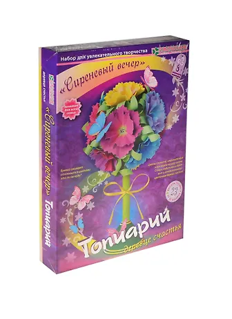 Описание: Деревце-топиарий могут сделать дети от 8-ми лет, - это несложно и увлекательно: сначала изготавливаются из бумаги цветы, а к ним дополнительные детали: бумага нарезается, складывается, подрезается или скручивается. Затем из картона складывается основа для кроны и изготавливается ствол и подставка. Собрав все картонные детали, украшаем шарообразную крону цветами и бабочками, завитками-листиками, а ствол - яркой атласной лентой. Упаковка: картонная коробка в термоусадочной плёнке