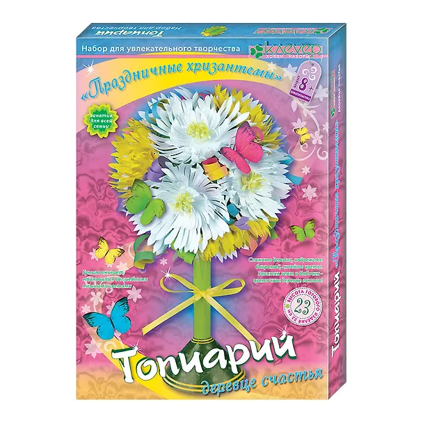 Топиарий - деревце, приносящее счастье, - абсолютно новый продукт на рынке творчества.Сделать Топиарий несложно: собирается картонная основа для кроны из готовой детали, в угол кроны вставляется склеенный ствол с опорой-подставкой. Затем крона украшается цветами, бабочками и листиками-завитками, а ствол - яркой лентой, - и волшебное деревце готово! Совместное создание Топиария станет увлекательным занятием для ребёнка старше 8 лет и его близких. Декоративное деревце, созданное в техниках «бумагопластики» и «киригамии», словно из волшебного сада, появится в доме и будет украшать его круглый год!