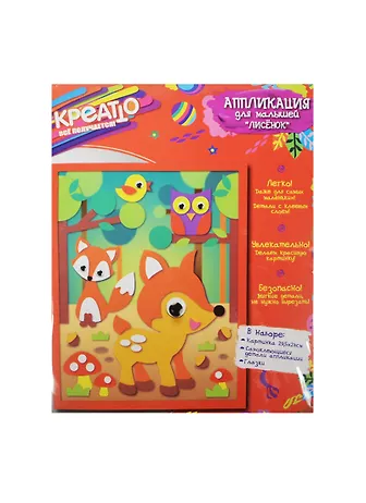 В наборе для объемной аппликации «Лисенок» ТМ «Креатто»: цветная картинка размером 29,5х24 см с рисунком, самоклеящиеся детали из мягкого материала ЭВА, пластмассовые вращающиеся глазки с клеевым слоем. Товар сертифицирован и предназначен для детей от 3 лет.