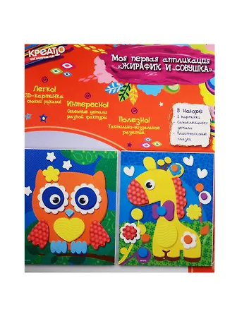 В наборе для 3D-аппликации: 2 цветные картинки 14х17 см (сова и жираф), рельефные самоклеящиеся детали из мягкого, приятного на ощупь материала EVA, пластиковые вращающиеся глазки с клеевым слоем. Все фрагменты легко приклеиваются и прочно держатся. Товар сертифицирован.