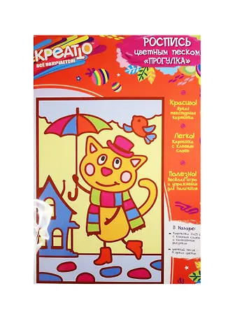 Добро пожаловать в творческий мир Креатто! Предложите малышу раскрасить картинку цветным песком. Эта увлекательная игра – отличное упражнение для пальчиков: тренирует тонкую пальцевую моторику и координацию мелких движений, а также развивает внимание и цв