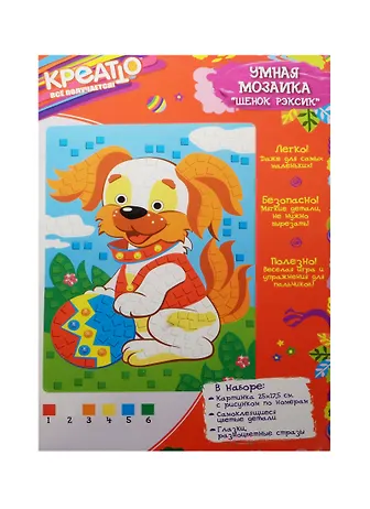 В наборе мозаики «Щенок Рэксик» ТМ «Креатто»: картинка размером 25х17,5 см с цветным рисунком по номерам, самоклеящиеся детали, которые не надо вырезать, пластмассовые глазки, блестящие разноцветные стразы. Части мозаики созданы из мягкого, приятного на ощупь материала ЭВА на клеевой основе, поэтому легко приклеиваются и прочно держатся. Товар сертифицирован. Упаковка – пакет с цветным вкладышем.