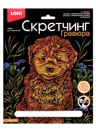 Гравюра вообще меня не впечатлила, так же как и ребенка. Смысл гравюры в том, что необходимо стереть в бумаги верхний слой, под которым находится рисунок. На этом все! В наборе уже положен специальный "шпатель", которым необходимо удалять верхний слой. Зато сколько мусора остается, который потом нужно убирать. Картинка собачки симпатичная, контур собаки золотистого цвета. Фон гравюры просто черный.
