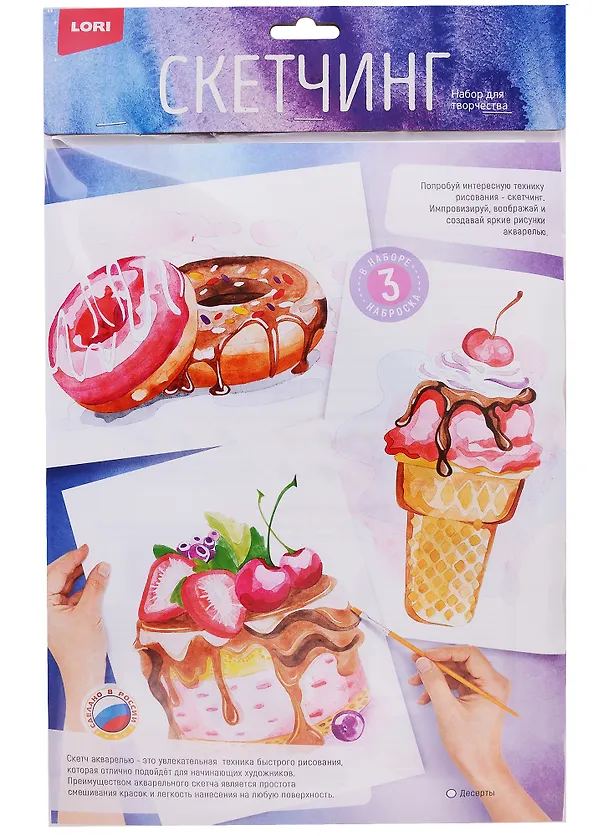 Очень хороший творческий набор. Основа для рисования и нанесенными контурами и краски в комплекте с кисточкой. Красивейшие рисунки получаются. Мы взяли сладости, были в наличии еще роботы. Очень классный! Ребенок в восторге! И цена приятная. Вообще люблю бренд Лори. У них много интересных и занимательных развивающих наборов.
