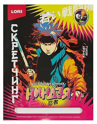 Скретчинг — это особый вид рисования методом сцарапывания верхнего слоя краски специальным инструментом — штихелем. В процессе работы, штрих за штрихом, проглядывается яркая цветная картинка с крутыми героями ниндзя, которые на черном фоне смотрятся необычно и стильно.