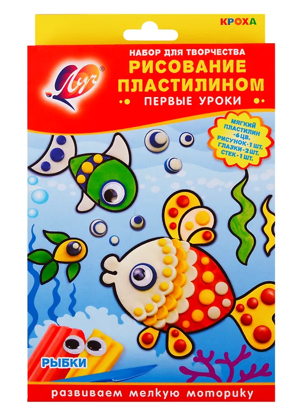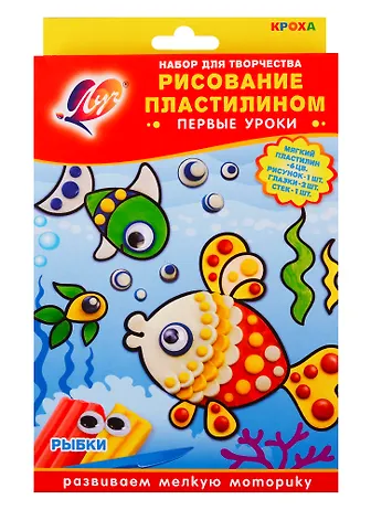 Набор ""Пластилиновая мозаика. Рыбки"" представлен в серии товаров для малышей ""Кроха"". В набор входит: пластилин мягкий 6 цветов, рисунок - 4 шт., глазки - 2 шт., стек - 1 шт. Некоторые детали рисунков не окрашены. Нужно предложить ребенку завершить картинки с помощью пластилина. Набор разработан с учетом особенностей общего развития малыша.