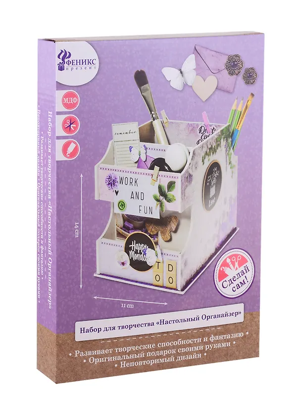Набор для творчества Настольный Органайзер фиолетовый (детали из МДФ, декоративная бумага, гуашевая краска, кисточка из пвх , двусторонний скотч) / 20x28x3см арт.79643