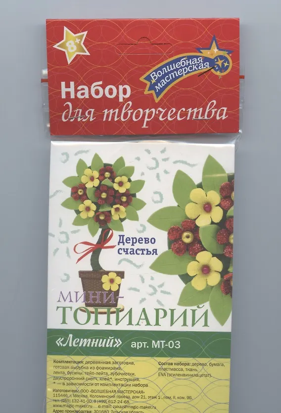 Серия мини-топиарии собрали в себе фрагменты всех видов топиариев. Модели выполнены на базе деревянной заготовки. В составе набора готовая вырубка цветов, листьев, ленты, бусины. Крепление деталей осуществляется на двусторонний скотч, что значительно облегчает процесс сборки. Миниатюрная модель размером 16*7 см прекрасно дополнит интерьер или будет милым подарком близкому человеку.
