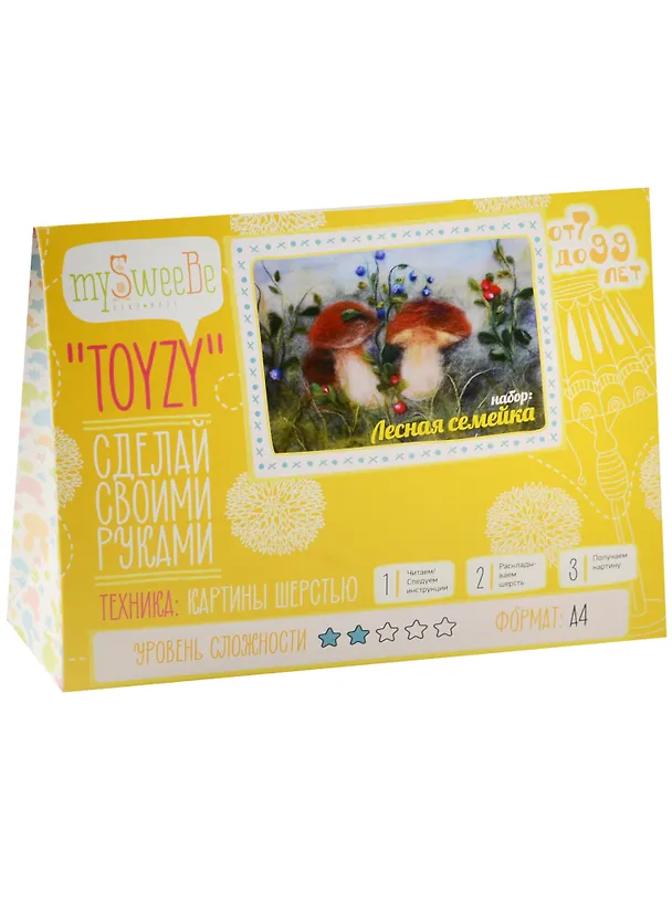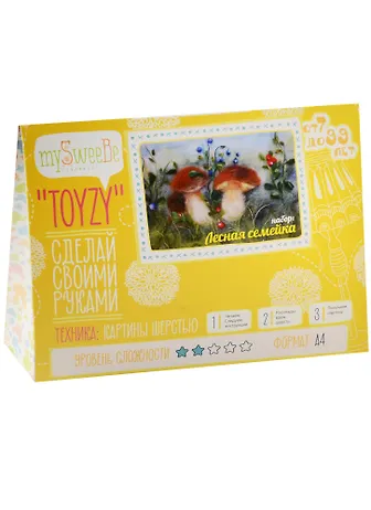 Набор для изготовления картин из шерсти Лесная семейка «Сделай своими руками «TOYZY» включает в себя: — детальную инструкцию и порядок работы; — все необходимые материалы и инструменты (в т.ч. шерсть, пинцет, подложку, дополнительные элементы). Шерсть, содержащаяся в наборе, являются 100% натуральной и качественной.