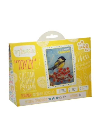 Набор для изготовления картин из шерсти Синичка «Сделай своими руками «TOYZY» включает в себя: — детальную инструкцию и порядок работы; — все необходимые материалы и инструменты (в т.ч. шерсть, пинцет, подложку, дополнительные элементы). Шерсть, содержащаяся в наборе, являются 100% натуральной и качественной.