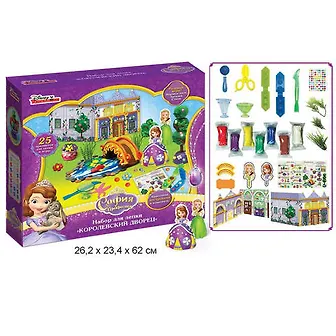 В наборе для лепки "Королевский дворец" ТМ Disney "София" 21 предмет: 7 цветов теста для лепки по 30 г, набор со стразами, 3 пластиковые веточки травки, 2 объемные формочки для лепки цветочков, стека, 2 вазочки, пластиковые ножницы, большая ложка, картонное игровое поле с декорациями замка, инструкция. Мягкое цветное тесто пластично, не липнет к рукам и не пачкается, застывает на воздухе за несколько часов. Внимание: НЕ пригодно для еды! Качественный пластик. Товар сертифицирован. Срок годности: 3 года. Упаковка - красочная коробка (26х23,4х6,1 см).