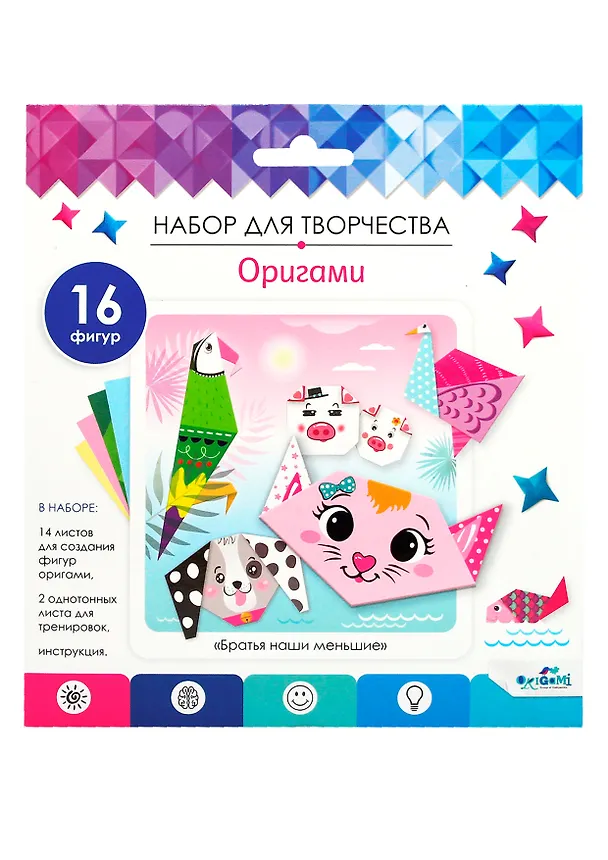 Набор для творчества ORIGAMI/Оригами Серия "Братья наши меньшие" займет вас и вашего ребенка на совместное проведения за складыванием этих фигур. В наборе идут по две одинаковые фигуры что позволяет делать их в двоем, так что вы соберете только 7 разных фигур. Есть в наборе инструкция по сборке. Клей не требуется но может пригодиться, если захотите эти фигурки как то применить например сделать ёлочные украшения или кукольный театр, закладку для книг.