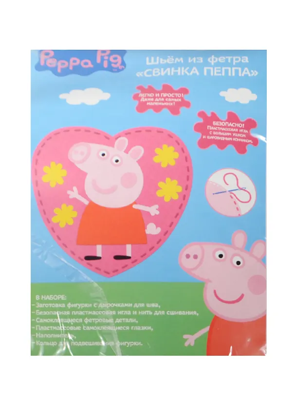 Описание: С набором «Шьем из фетра» ТМ “Peppa Pig” вы создадите милую игрушку Свинку Пеппу своими руками! Это очень просто даже для самых малышей. В наборе есть всё, чтобы научиться шить. Ваш ребенок научится работать с иголкой, сошьет сердечко и фигурку Свинки Пеппы по дырочкам для стежков. Вам останется только набить игрушку, зашить и затянуть узелки. И в конце наклеить фигурку Свинки Пеппы, размером 16 см. Вот и всё - ваша мягкая игрушка готова! Набор сертифицирован и предназначен для деток с 3-х лет.