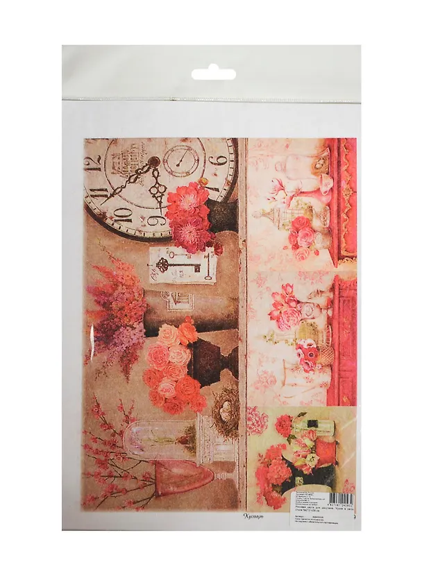 Рисовая бумага - мягкая бумага с выраженной волокнистой структурой легко повторяет форму любых предметов. Размер 21х29 см, плотность бумаги 35 гр. Работая с этой бумагой, Вам не потребуется никакой дополнительной подготовки перед началом работы. Вы просто вырезаете или вырываете нужный фрагмент, и хорошо проклеиваете бумагу на поверхности изделия. Рисовая карта для декупажа идеально подходит для стекла.В отличие от салфеток, при наклеивании декупажные карты практически не рвутся и совсем не растягиваются. Клеить их можно как на светлую, так и на темную поверхность. Для новичков в декупаже – это очень удобно и гарантируется хороший результат. Поверхность, на которую будет клеиться декупажная