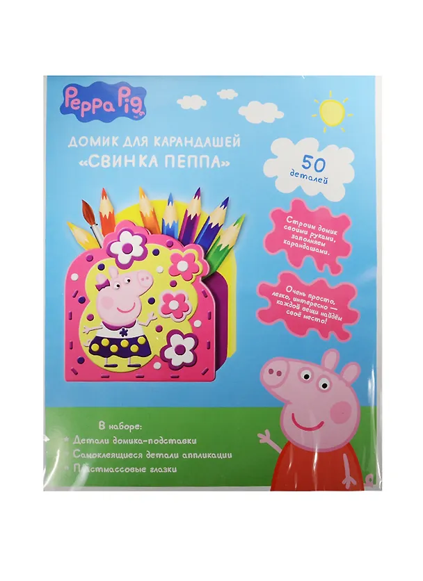 В наборе для создания домика для карандашей "ЦВЕТНИК ПЕППЫ" ТМ "Peppa Pig" более 50 деталей: детали домика-подставки, самоклеящиеся детали из мягкого материала ЭВА. Товар сертифицирован. Срок годности: 5 лет.